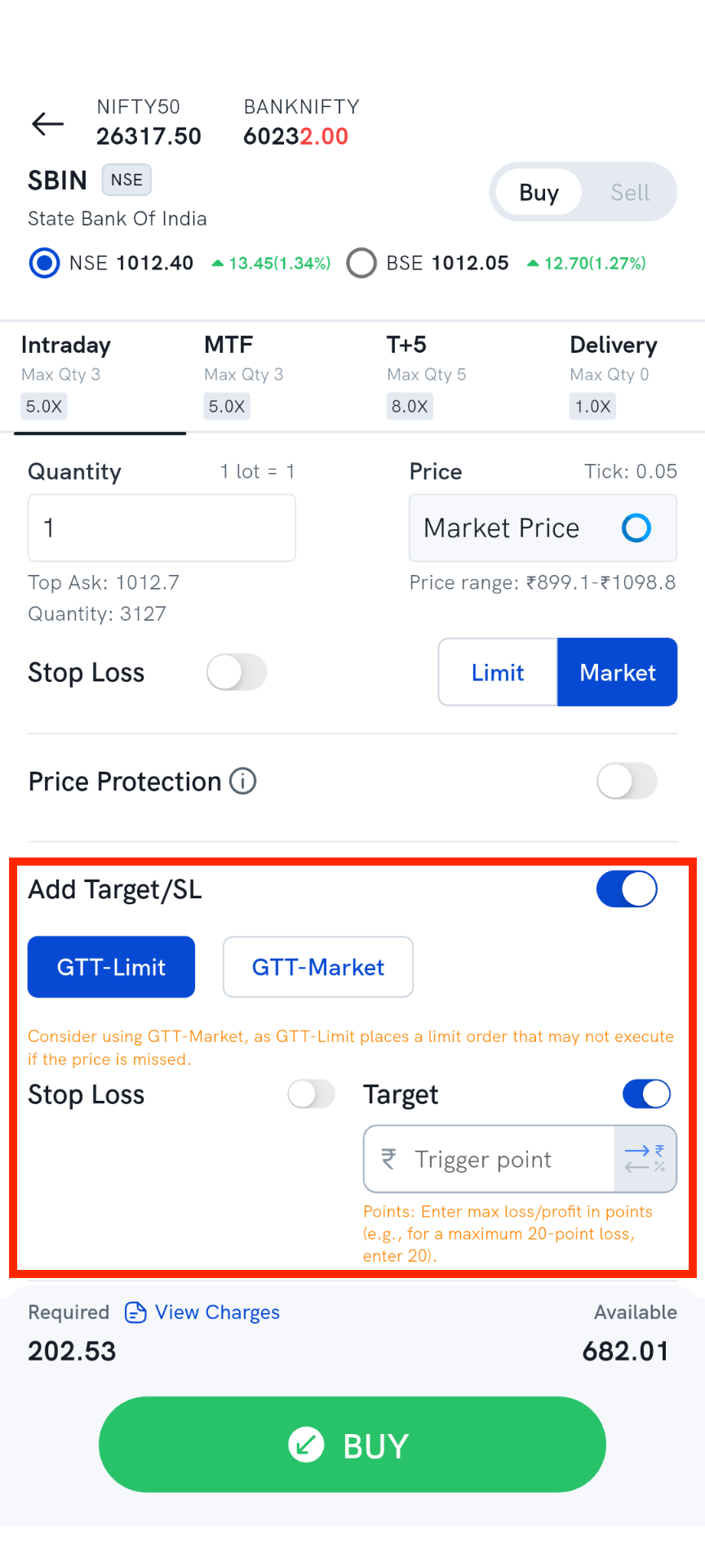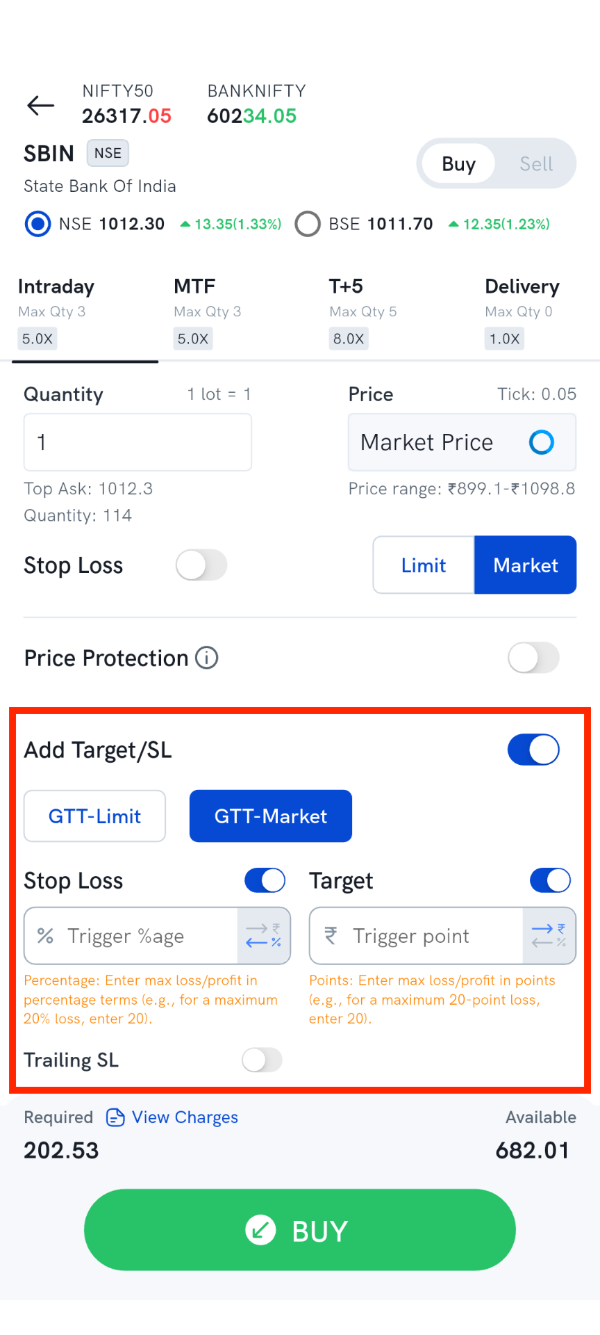 Similarly, if you want to set the sell target price while placing the main buy order you can enable the “Target” switch in the “Order placement” screen and then input the target percentage in the target field. The target trigger price will be calculated based on the average buy price of your main buy leg order. If you want your order to get executed at market price once the trigger condition is met then select the “GTT-M” button. If “GTT-L” is selected then a limit order will be placed with limit price same as trigger price